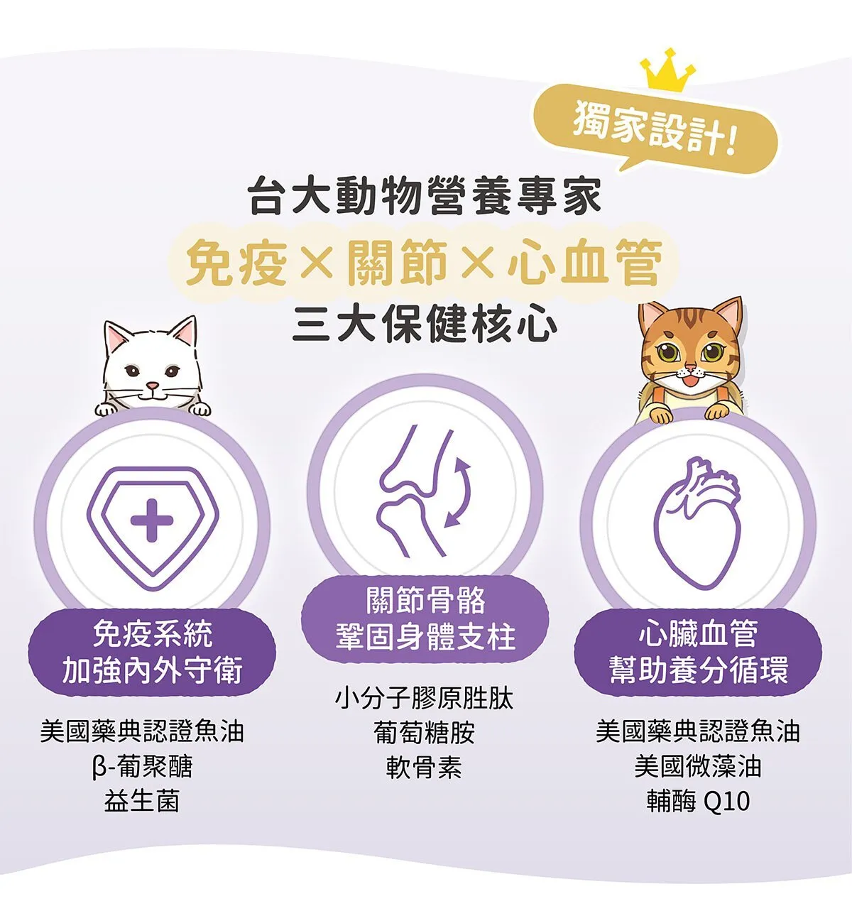 ▹ 小分子膠原胜肽、葡萄糖胺、美國微藻油、輔酶Q10等重本添加