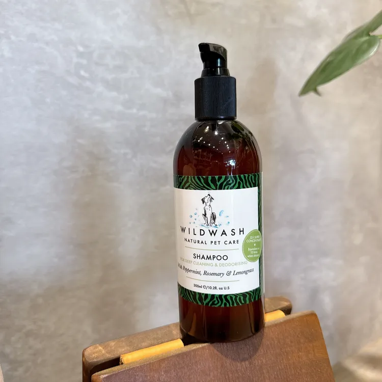 用溫水將寵物毛髮沾濕後,將稀釋後的WildWash洗毛精使用於身體各部位,溫柔地按摩皮膚與被毛,其中,請避開眼睛區域。為了達到最佳效果,將洗毛精在皮膚與毛髮上停留數分鐘,讓藥草與精油能發揮其作用。接著,將全身沖洗乾淨,如果有必要可以再重複上述一次流程。最後,接著使用WildWash潤絲精。