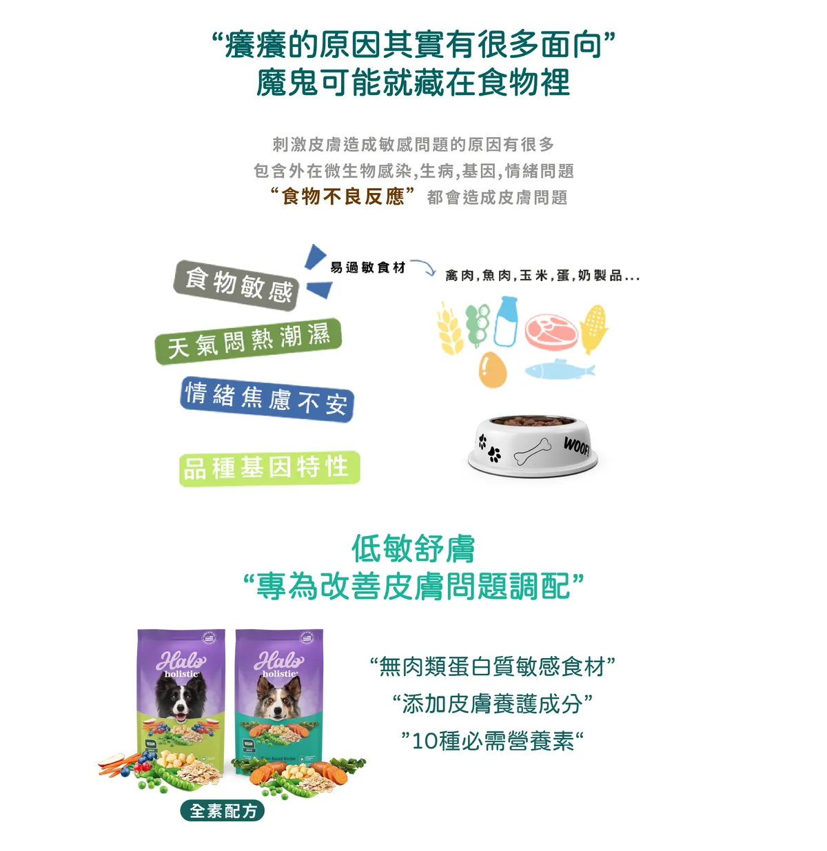 燕麥,豌豆,鷹嘴豆,馬鈴薯蛋白,啤酒酵母粉,植物油(以綜合維生素E保存),亞麻籽,海帶,天然香料,酵母菌,磷酸二鈣,大麥,豌豆蛋白,礦物質,牛磺酸,天然鹽,菊苣纖維,海洋微藻,維生素,乾乳酸芽孢菌,綜合維生素E(天然防腐劑),迷迭香萃取物