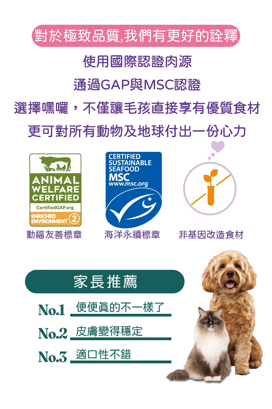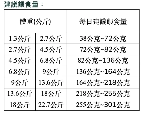 粗蛋白質不低於25%、粗脂肪不低於15%、粗纖維不高於5%、水分不高於9%、維他命E不低於225 IU/kg、牛磺酸不低於0.15%、Omega-3 不低於0.8%、Omega-6不低於3.2%、葡萄糖胺不低於1,250 mg/kg、軟骨素不低於1,250 mg/kg、芽孢乳酸菌不低於500,000,000 CFU/454g