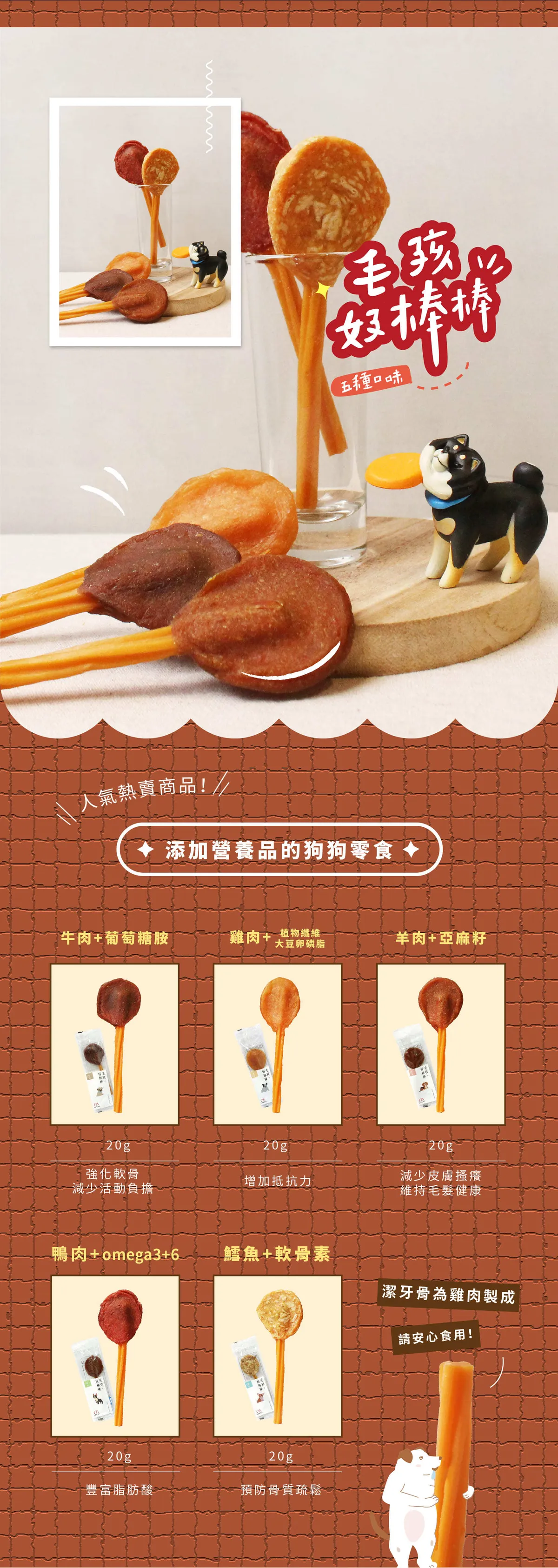 狗狗專屬的棒棒糖,整根皆為肉製成,且五種口味添加不同營養品