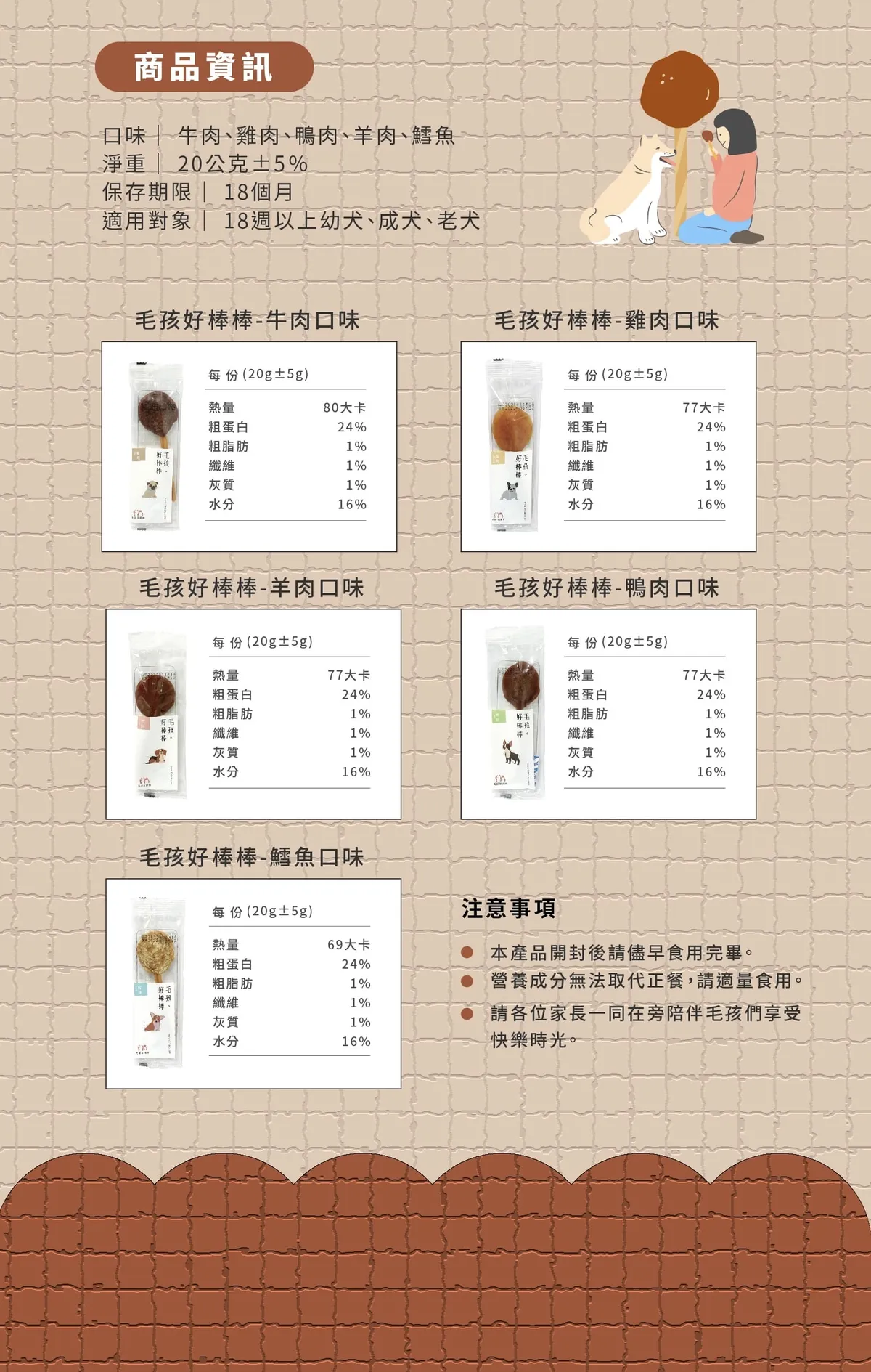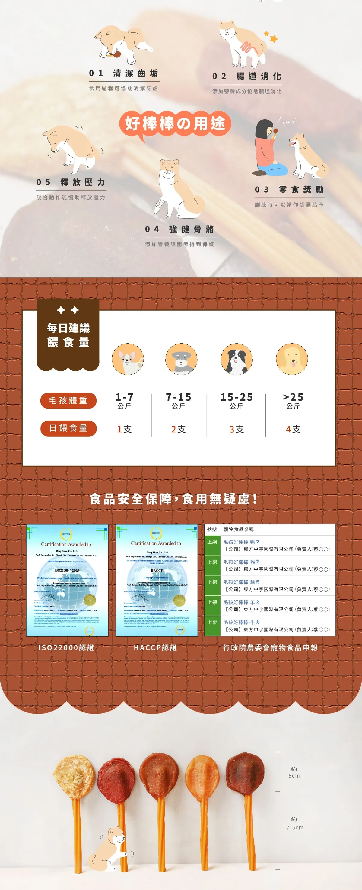 狗狗專屬的棒棒糖,整根皆為肉製成,且五種口味添加不同營養品