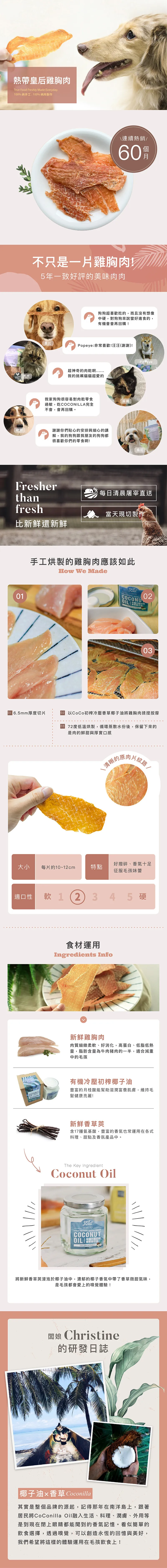 將Coconilla椰子油輕輕按摩至與雞胸肉緊密結合,低溫烘製後口感酥脆易咬,是毛孩心中的第一名好食!為天然無添加寵物手工零食